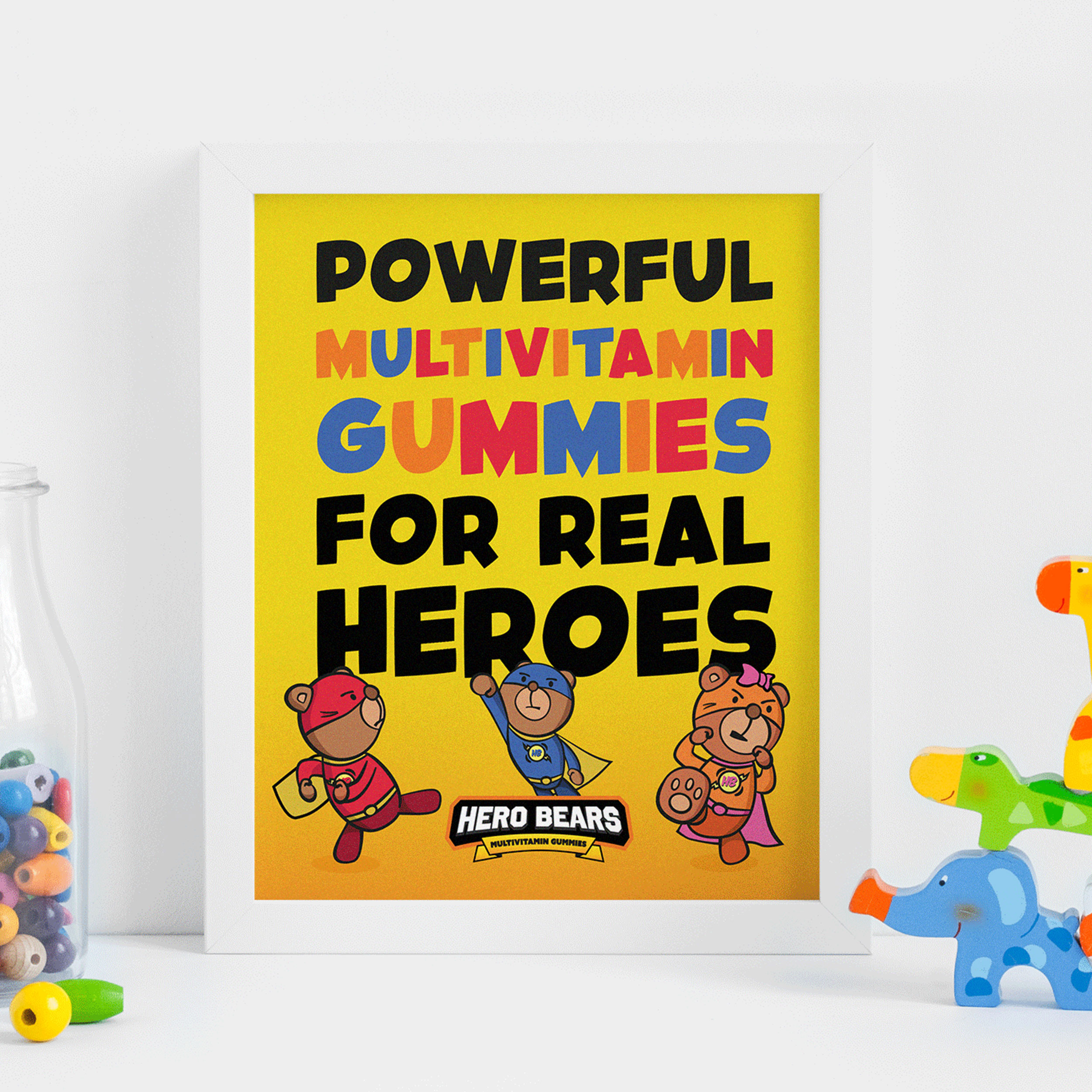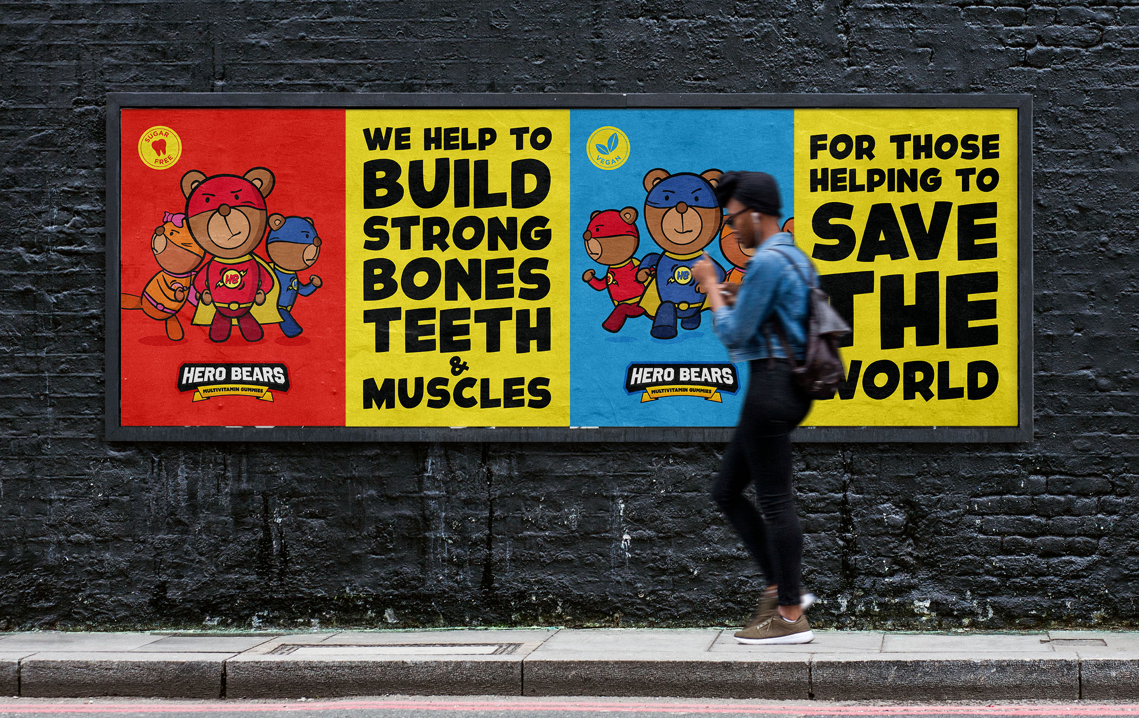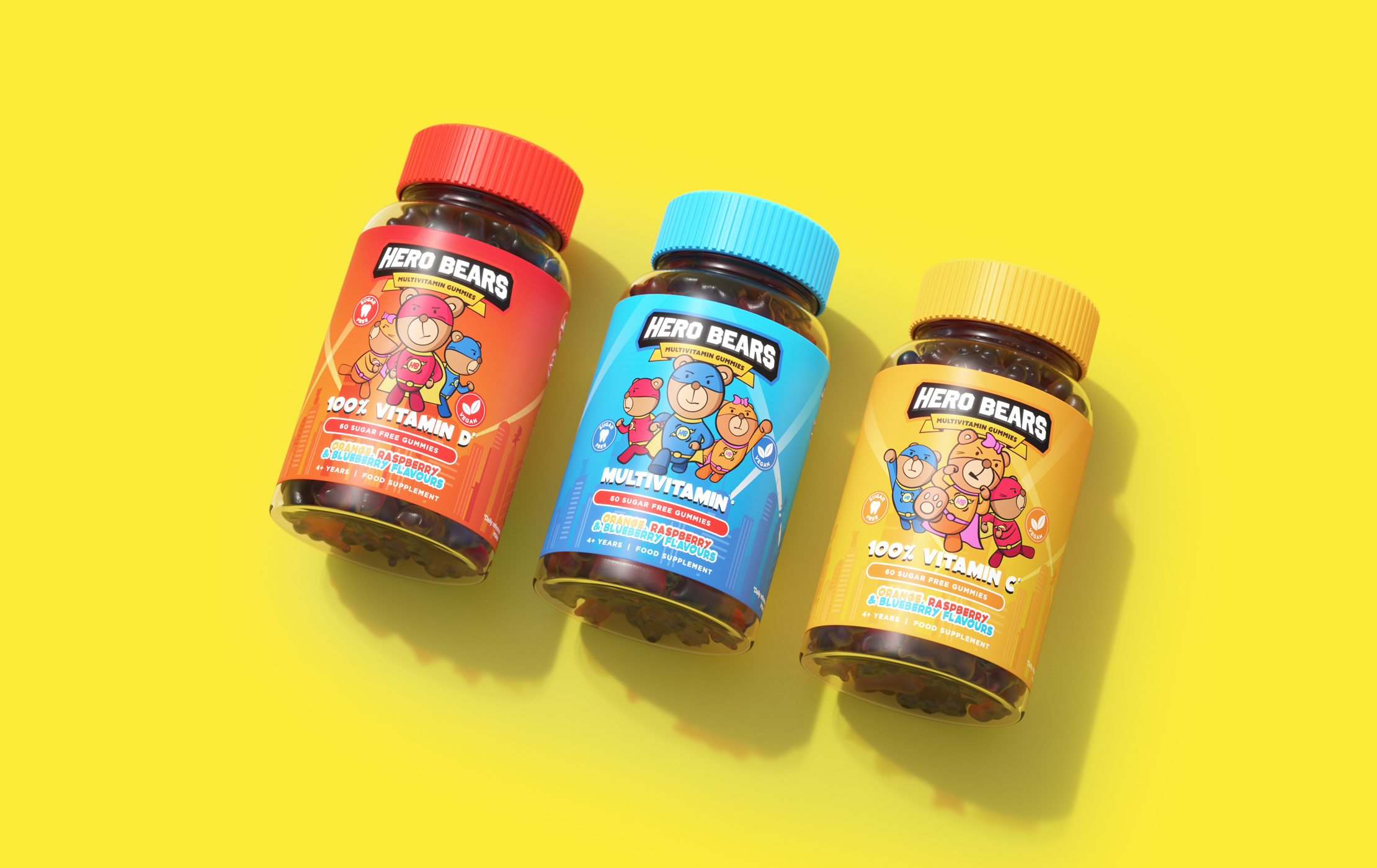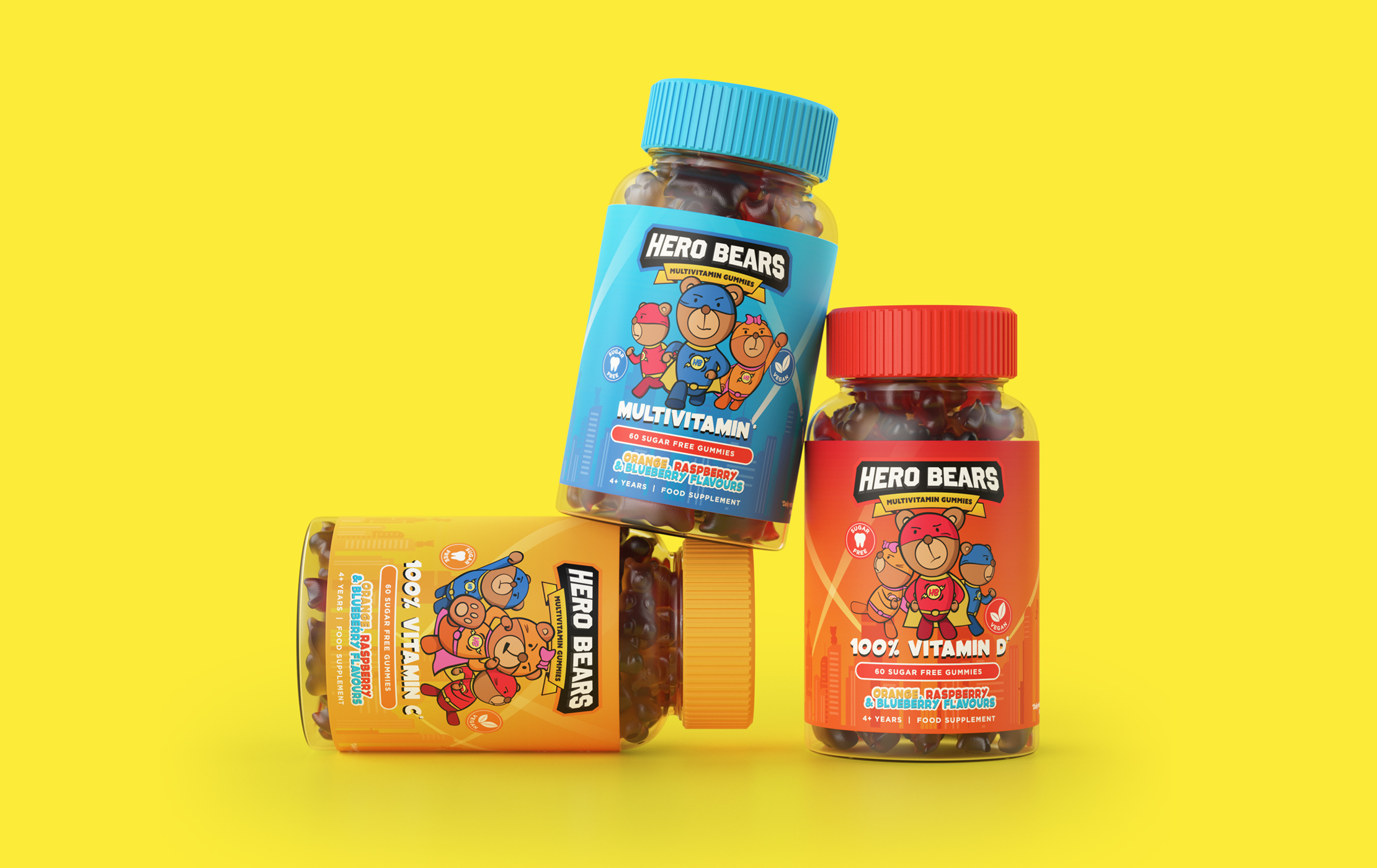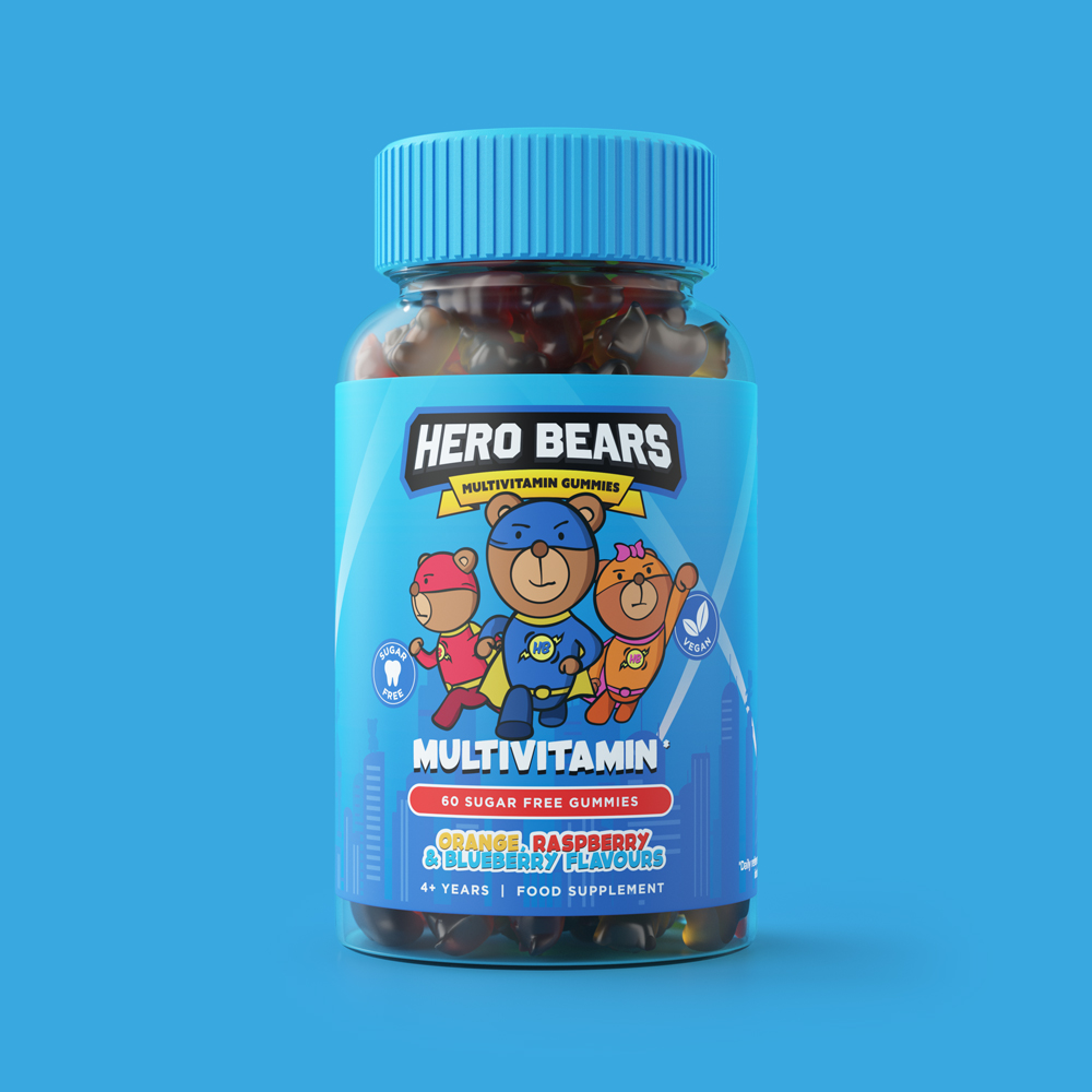 Every child deserves a hero, and a healthy one at that. Hero Bears is a children's gummy vitamin supplement built around a simple, powerful idea: that kids themselves are the heroes. We named the brand, defined its positioning, and brought it to life through a handcrafted visual identity, a warm tone of voice, and a cast of three original bear characters, each with a distinct personality designed to spark a favourite. The characters do the heavy lifting. Bold, illustrative, and full of personality, each bear takes centre stage on its own flavour variant - giving children something to connect with and collect. The result is a brand that doesn't feel like a supplement; It feels like something kids actually want.