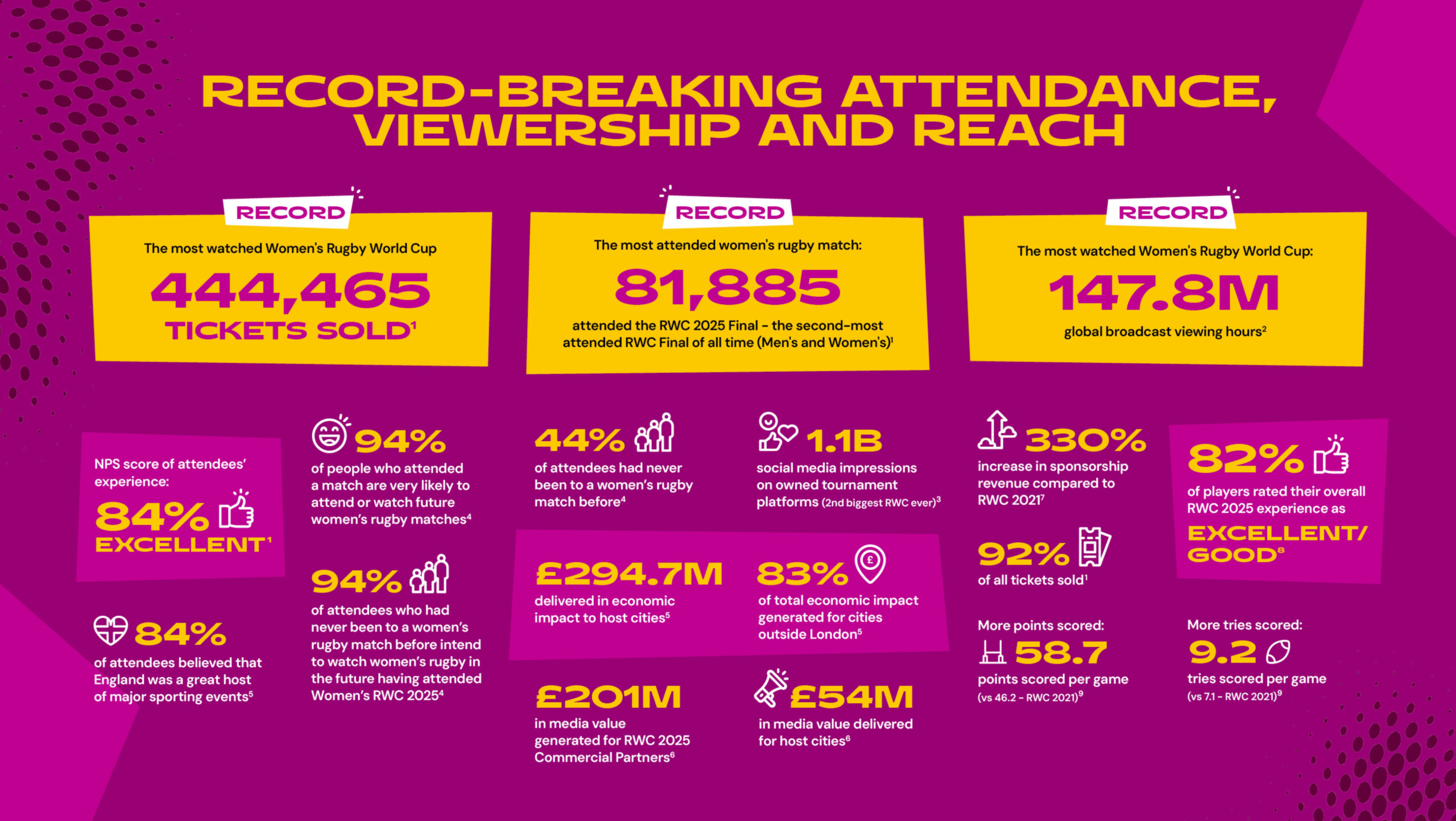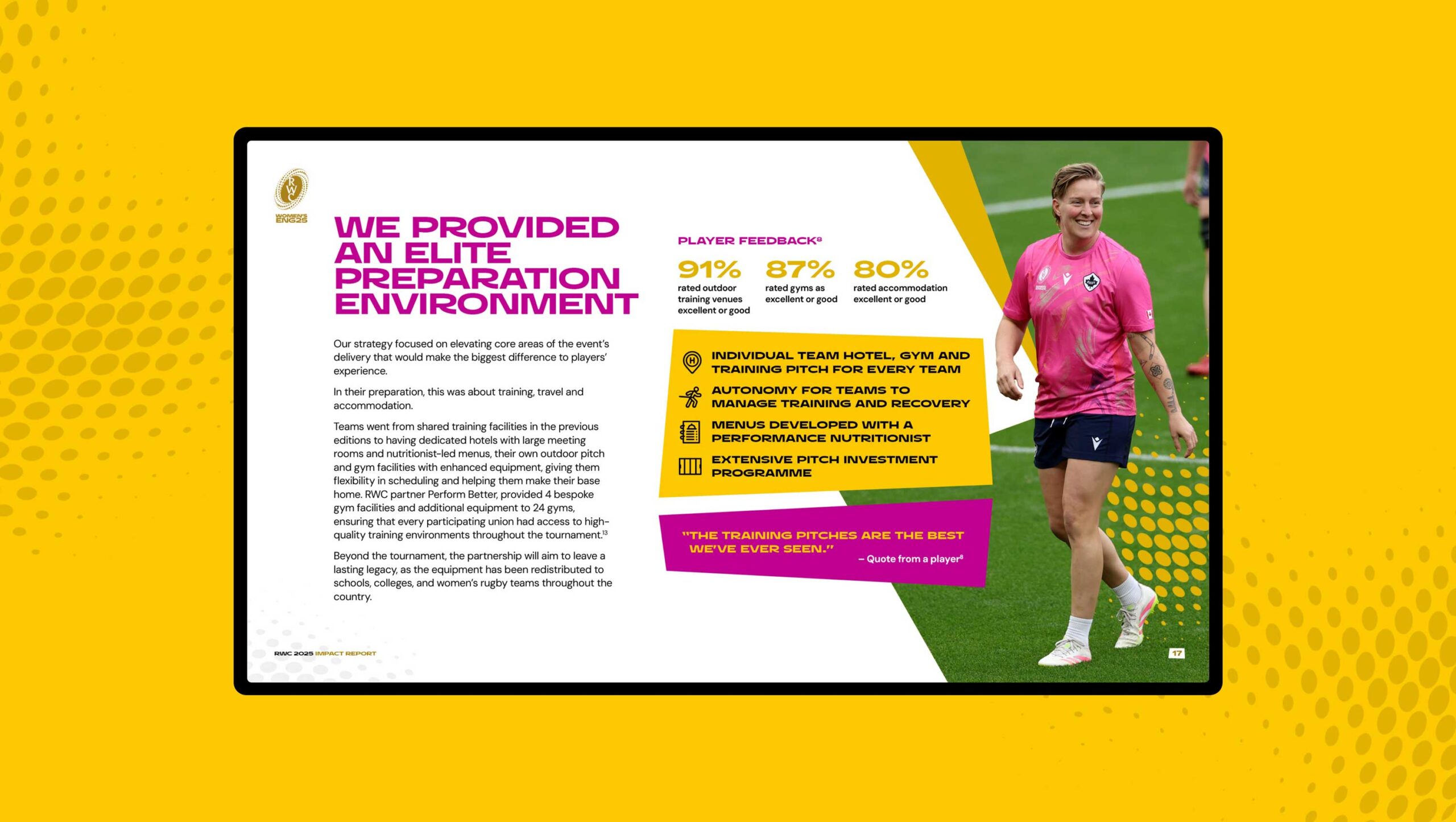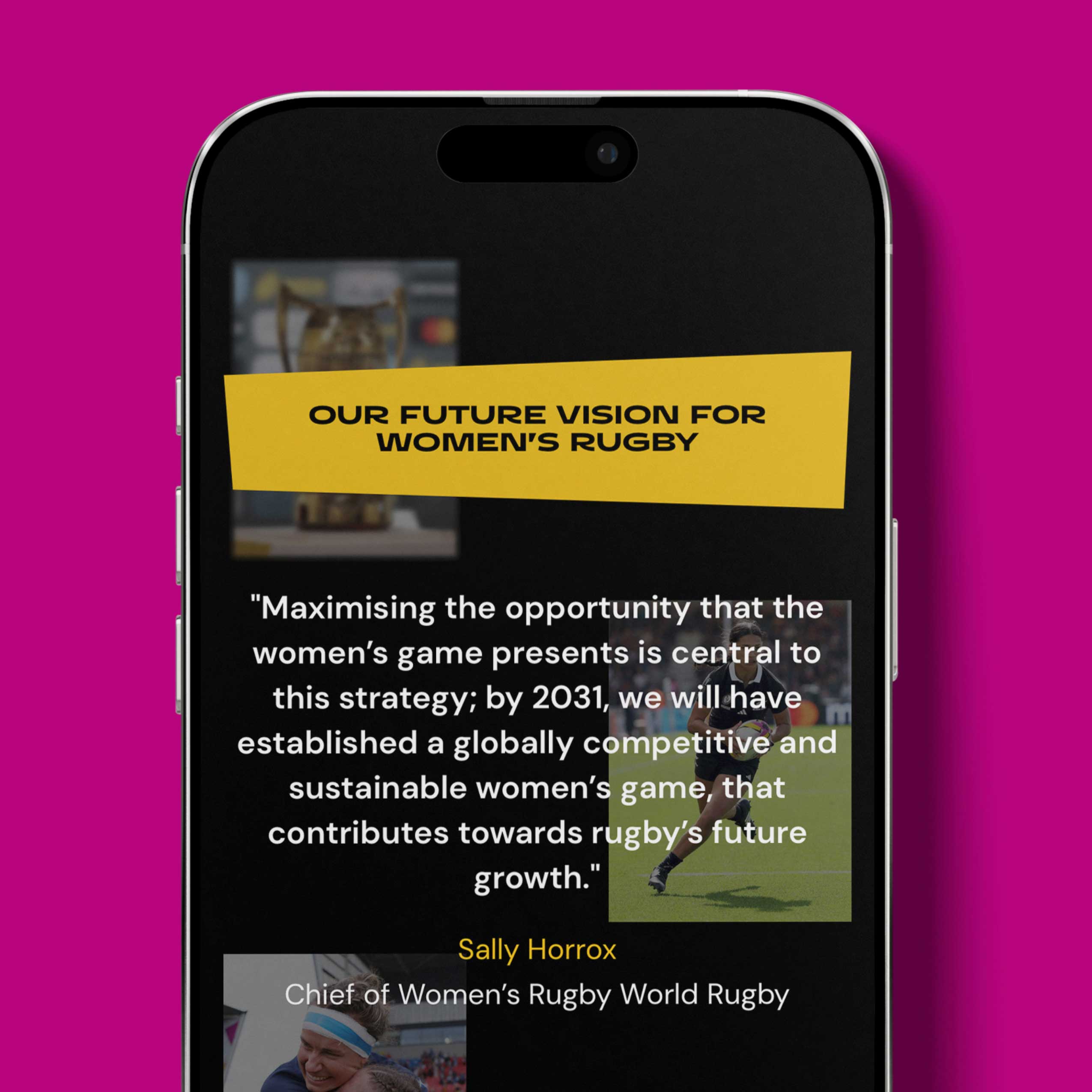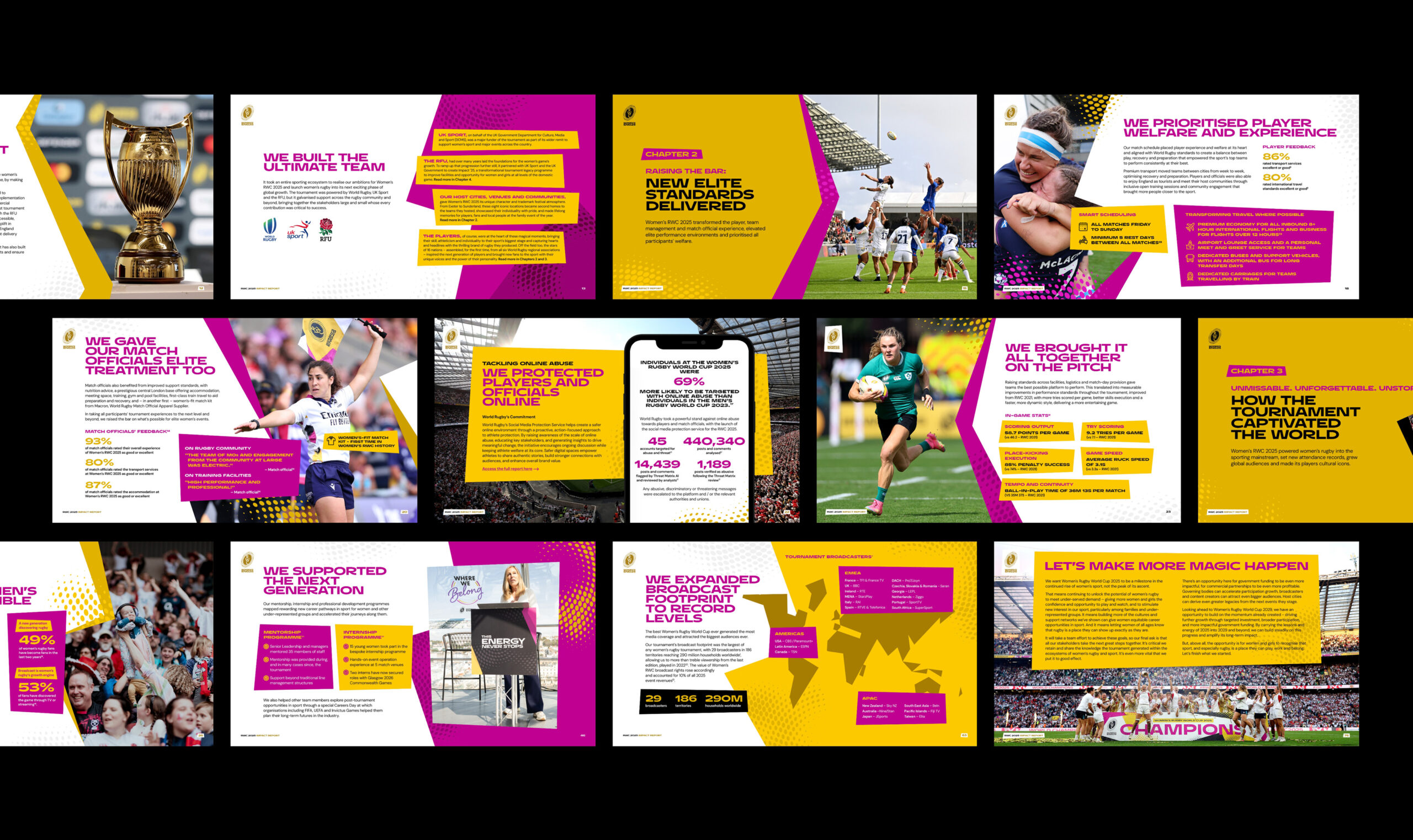 We partnered with World Rugby and The Sports Consultancy to showcase the impact of the Women’s Rugby World Cup 2025 and the initiatives that surrounded it. This included two impact reports - one digital and animated, alongside an interactive website. The project focused on clear, engaging storytelling, bringing the tournament’s wider impact to life through motion, design, and an immersive digital experience.
